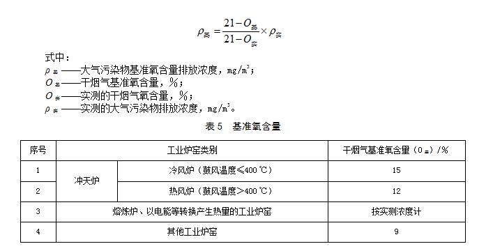 實(shí)測的工業(yè)爐窯排氣筒中大氣污染物排放濃度,應(yīng)按以下公式換算為基準(zhǔn)氧含量下的排放濃度,并以此濃度作為判定排放是否達(dá)標(biāo)的依據(jù)。各類工業(yè)爐窯的基準(zhǔn)氧含量按表5的規(guī)定執(zhí)行。
