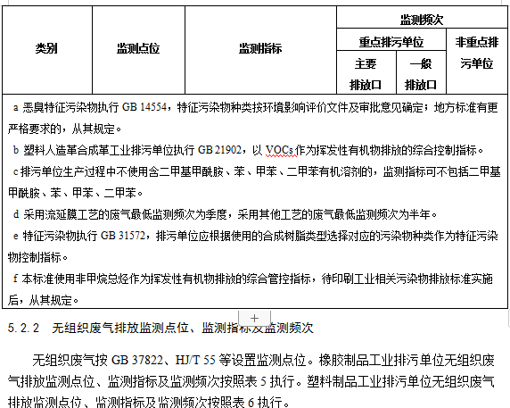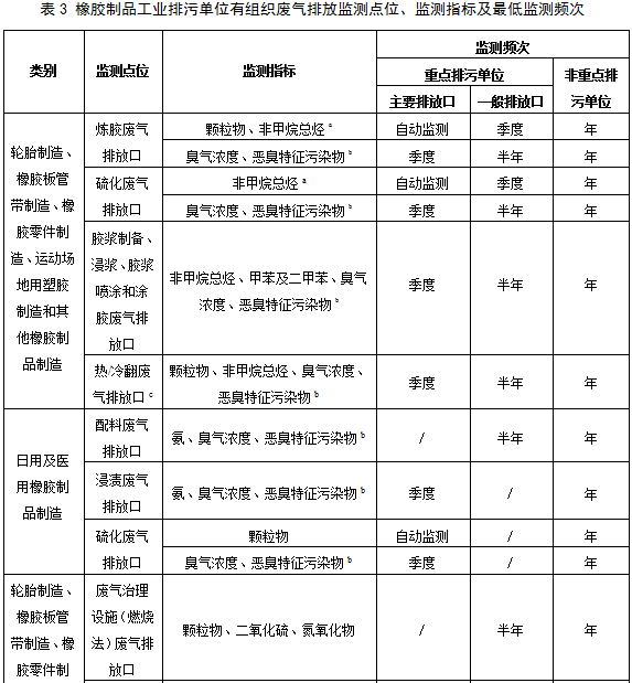 5.2.1.2橡膠制品工業(yè)排污單位有組織廢氣排放監(jiān)測點(diǎn)位、監(jiān)測指標(biāo)及最低監(jiān)測頻次按照表3執(zhí)行。