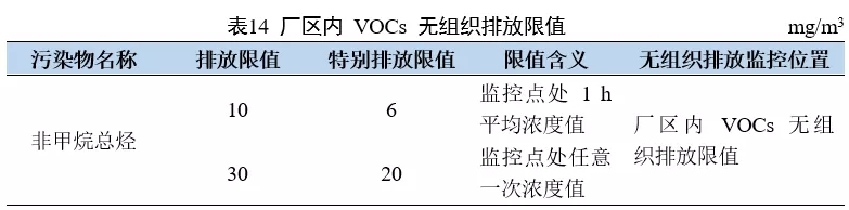 本標(biāo)準(zhǔn)規(guī)定了 VOCs物料儲(chǔ)存無(wú)組織排放控制要求、VOCs物料轉(zhuǎn)移和輸送無(wú)組織排放控制要求、工藝過(guò)程 VOCs無(wú)組織排放控制要求、設(shè)備與管線組件 VOCs 泄漏控制要求、敞開液面 VOCs無(wú)組織排放控制要求,以及VOCs無(wú)組織排放廢氣收集處理系統(tǒng)要求、企業(yè)廠區(qū)內(nèi)及周邊污染監(jiān)控要求。標(biāo)準(zhǔn)適用于涉及 VOCs無(wú)組織排放的現(xiàn)有企業(yè)或生產(chǎn)設(shè)施的 VOCs無(wú)組織排放管理,以及涉及VOCs無(wú)組織排放的建設(shè)項(xiàng)目的環(huán)境影響評(píng)價(jià)、環(huán)境保護(hù)設(shè)施設(shè)計(jì)、竣工環(huán)境保護(hù)驗(yàn)收、排污許可證核發(fā)及其投產(chǎn)后的 VOCs無(wú)組織排放管理。標(biāo)準(zhǔn)主要對(duì)無(wú)組織管控提出要求,在限值方面,強(qiáng)調(diào)了廠區(qū)內(nèi) VOCs 無(wú)組織排放的限值要求,見下表。該標(biāo)準(zhǔn)已于 2020 年 7 月 1 日起全面實(shí)施。